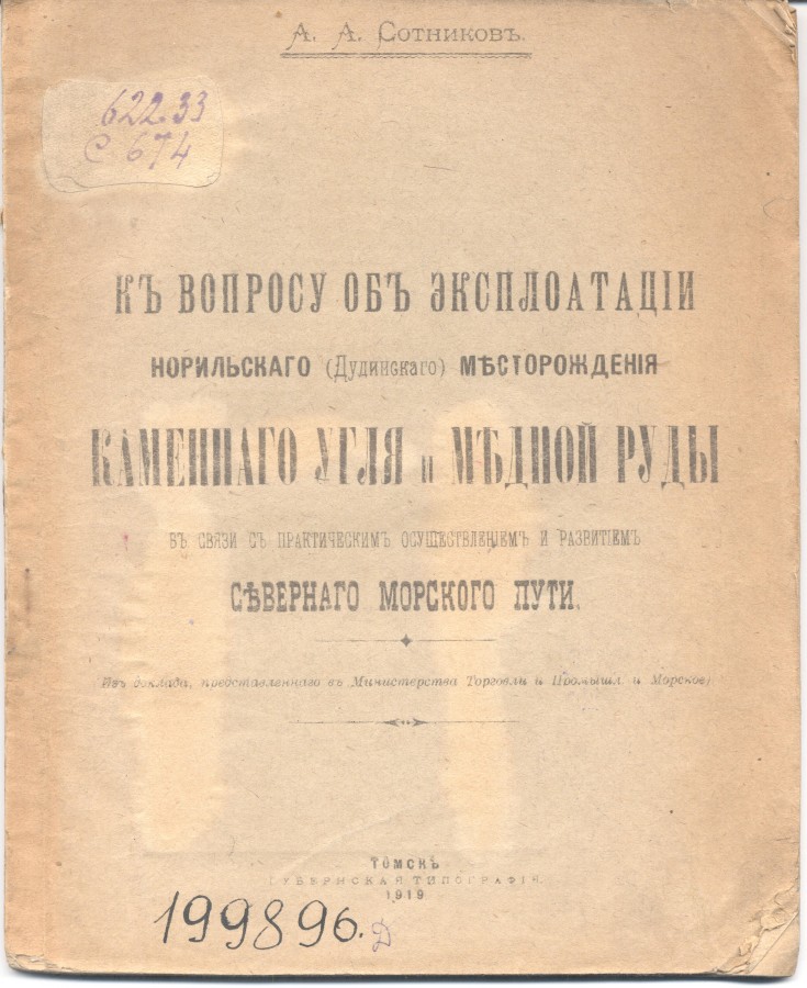Летом 1915 г. А.А. Сотников, тогда студент первого курса горного отделения Томского технологического института, во время своей побывки на родине в селе Потаповское, близ Дудинки, съездил в Норильск, где собрал образцы горных пород и угля, которые вместе с записями передал мне с просьбой обработать. Я тогда был студентом уже третьего курса горного отделения института и владел методикой петрографо-минералогического исследования горных пород